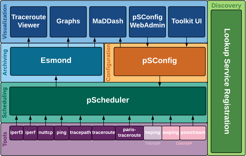 perfSONAR는 글로벌 인프라에 문제가 발생할 때 이를 식별하고 격리하는 데 도움이 되므로 엔지니어링 팀이 네트워크 사용자를 지원하는 역할을 보다 쉽게 하고 네트워크 리소스를 활용할 때 생산성을 높일 수 있다. 측정 예약, 균일한 형식의 데이터 저장 및 데이터를 검색하고 시각화를 생성할 수 있는 확장 가능한 방법을 허용하는 통일된 인터페이스를 제공한다.