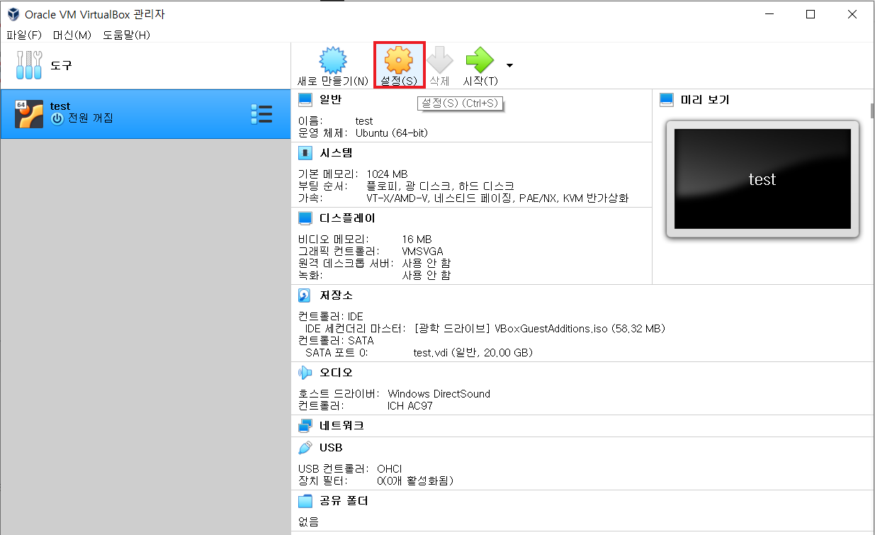 가상 머신 선택하고 설정 클릭