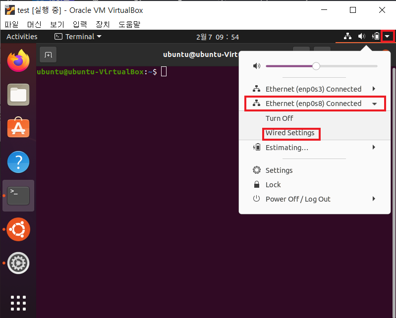 오른쪽 위 화살표 클릭 - Ethernet(enp0s8) 클릭 - Wired Settings 클릭