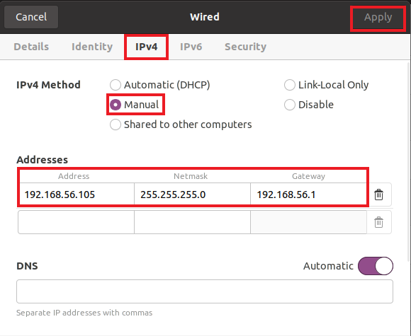 IPv4 선택 - Manual 클릭 - 주소 입력 - 적용