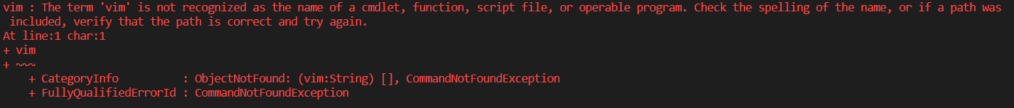 The term 'vim' is not recognized as the name of a cmdlet, function, script file, or operable program. Check the spelling of the name, or if a path was included, verify that the path is correct and try again.