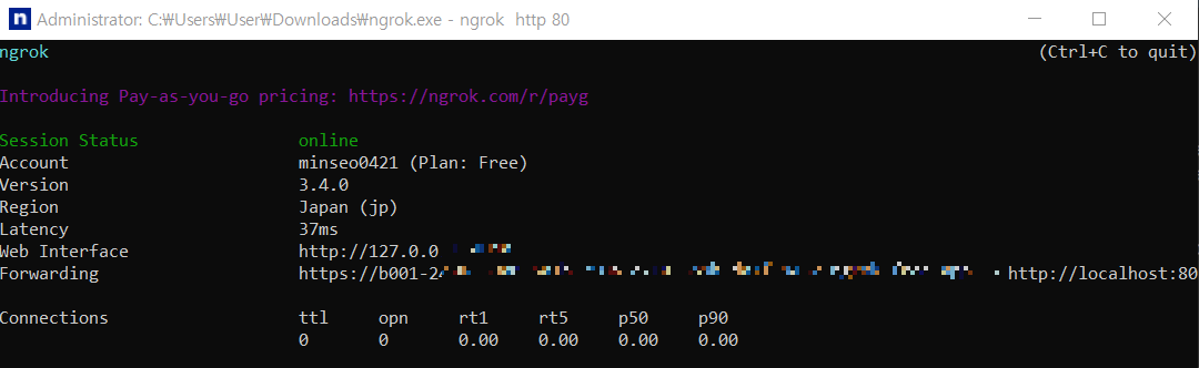 그리고 3번에 나와있는 것처럼 ngrok http 80을 했을 때 다음과 같이 나온다면 잘 설치가 된 것입니다!!